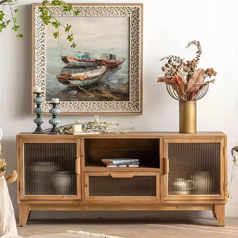 With sleek design and ample storage options, our TV stand enhances any living room. The wooden construction provides durability and the glass doors add a touch of elegance. Make clutter a thing of the past with the convenient storage drawers.
